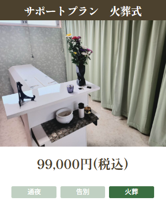 祭壇をお飾りせず火葬のみを行います。弊社指定の霊安所まで搬送し、お葬式のお打合せをいたします。その後の手続き等は弊社で行いますので、ご家族の方は葬儀当日まで故人をお偲び下さい。火葬後は、ご遺骨をご自宅に安置して頂きます(ご自宅で安置できない場合は、ご遺骨をお預かりする「預骨」もございます)。以上がこちらのプランの流れになります。その他、出棺束(お花)などのオプションもご用意しております。表示金額は基本料金になります。くわしくはお問い合わせ下さい。